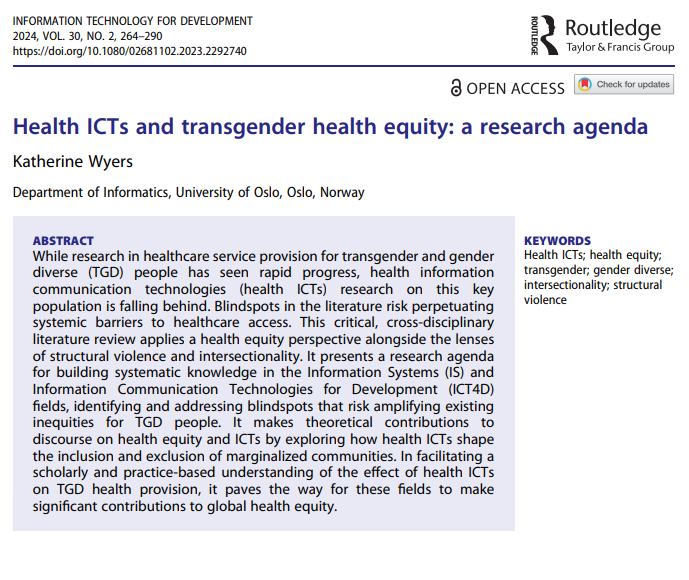 Wyers, K. (2024). Health ICTs and transgender health equity: A research agenda. Information Technology for Development, 30(2), 264–290.